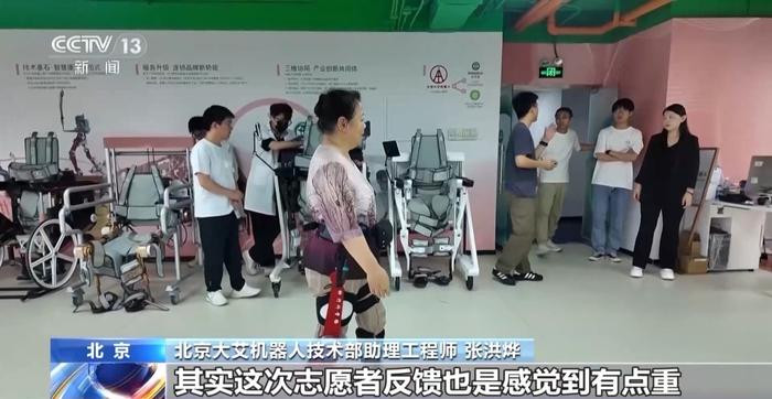 北京大艾机器人技术部助理工程师张洪烨:在穿戴方面,老人其实更希望是让它更简单、更易上手,能自己独立完成穿戴。在配重方面,其实这次志愿者反馈也是感觉到有点重,我们后续应该是再减重。
